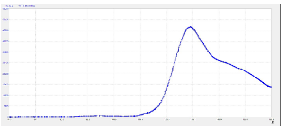 塑料薄膜在70到150度之間,并沒(méi)有完全融化,而是逐漸軟化過(guò)程,要測(cè)它粘度或者粘性歲溫度的變化,確實(shí)難度很大,一是薄膜很薄,二是因沒(méi)有完全融化,沒(méi)填充滿轉(zhuǎn)子與底板的間隙空間,開(kāi)始測(cè)粘度曲線沒(méi)有啥規(guī)律,但是經(jīng)過(guò)多次改進(jìn)轉(zhuǎn)子和測(cè)試方法后,測(cè)試曲線如下,