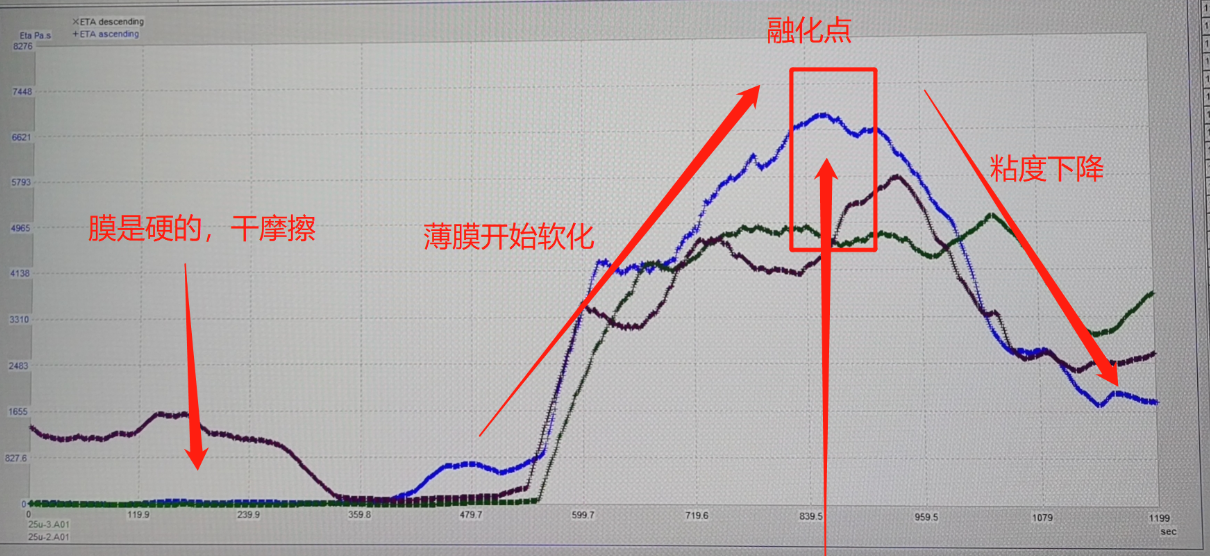 在生產(chǎn)過(guò)程中,需要研究薄膜的粘度與溫度的變化曲線,薄膜隨著溫度的升高,薄膜狀態(tài)變化從固態(tài)硬化-半軟化,軟化,在硬化過(guò)程;
